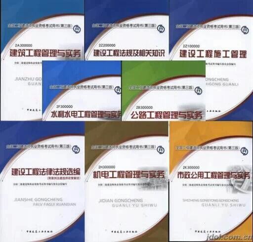 專業(yè)實(shí)務(wù)課:《建設(shè)工程施工管理與實(shí)務(wù)》、《公路工程管理與實(shí)務(wù)》、《水利水電工程管理與實(shí)務(wù)》、《機(jī)電工程管理與實(shí)務(wù)》、《市政工程與管理》;《建設(shè)工程施工管理與實(shí)務(wù)模擬試題及解析》、《公路工程管理與實(shí)務(wù)模擬試題及解析》、《水利水電工程管理與實(shí)務(wù)模擬試題及解析》、《機(jī)電工程管理與實(shí)務(wù)模擬試題及解析》、《市政工程與管理模擬試題及解析》。