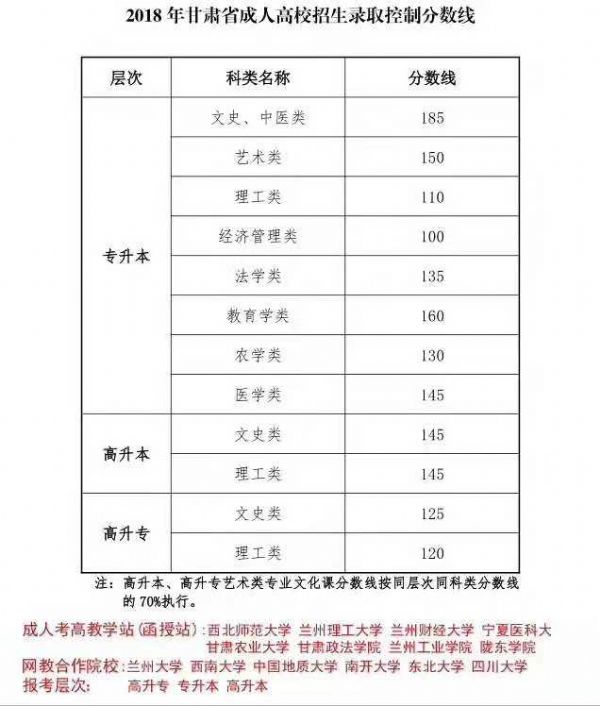 2018年甘肅省成人高校招生錄取控制分數(shù)線