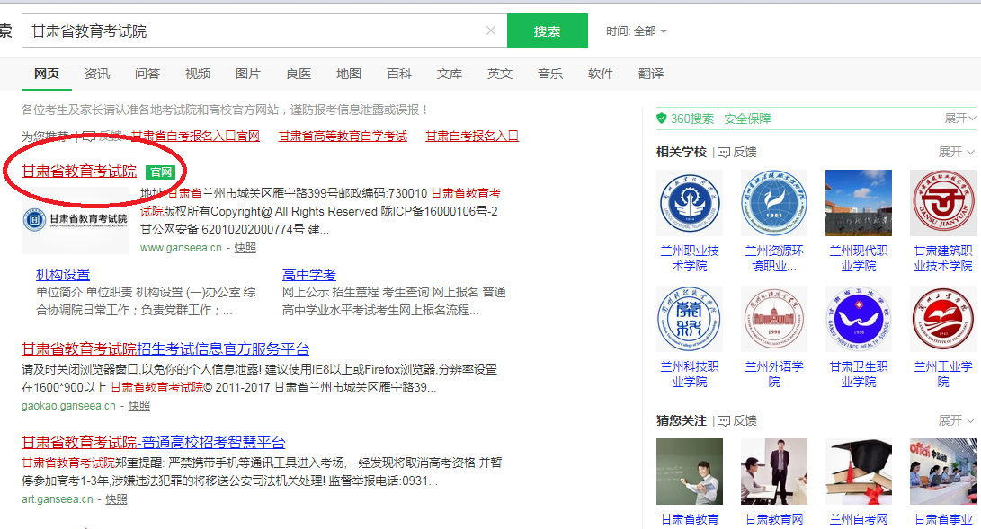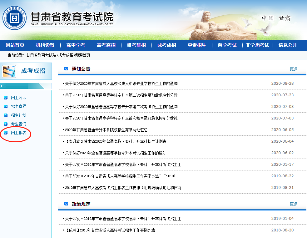 二、新冠肺炎確診病例、無癥狀感染者、疑似患者、確診病例密切接觸者等“四類人員”不得參加考試。三、考生進入考點、考場時不得因為佩戴口罩影響身份識別?荚嚻陂g,考生自備口罩?忌進入考場前必須佩戴口罩,進入考場后建議考生全程佩戴口罩。隔離考場的考生必須全程佩戴口罩。四、考試期間,考生必須嚴格遵守《2020年甘肅省成人高考防疫工作方案》要求和成人高考相關規(guī)定,完全服從考點工作人員安排。五、10月21日起,考生登錄甘肅省教育考試院網(wǎng)站自行打印準考證(具體打印流程見第八條)。同時打印《2020年甘肅省成人高考考生安全考試承諾書及身體健康狀況監(jiān)測表》(見附件2),并簽字確認,于第一場考試時交監(jiān)考人員。六、考生不得提供身體健康狀況虛假信息。對于隱瞞行程、隱瞞病情、故意壓制癥狀、瞞報漏報健康情況的考生,一經(jīng)發(fā)現(xiàn),一律不得參加考試,并追究本人及相關人員的責任。七、開考15分鐘后考生不得進入考場,離考試結(jié)束前30分鐘方準交卷離場。1、瀏覽器搜索http://www.ganseea.cn/進入甘肅省教育考試院官方網(wǎng)站;