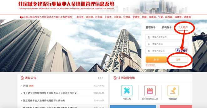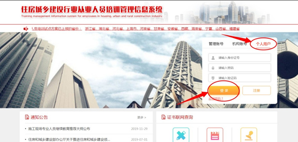 使用電腦打開瀏覽器登錄住房和城鄉(xiāng)建設(shè)行業(yè)從業(yè)人員培訓(xùn)管理信息系統(tǒng)(網(wǎng)址 http://rcgz.mohurd.gov.cn) 進(jìn)行免費(fèi)注冊(cè),須使用市面主流瀏覽器,如谷歌或 360 瀏覽器并調(diào)至極速模式。學(xué)員請(qǐng)選擇個(gè)人用戶登錄端口,如圖所示: