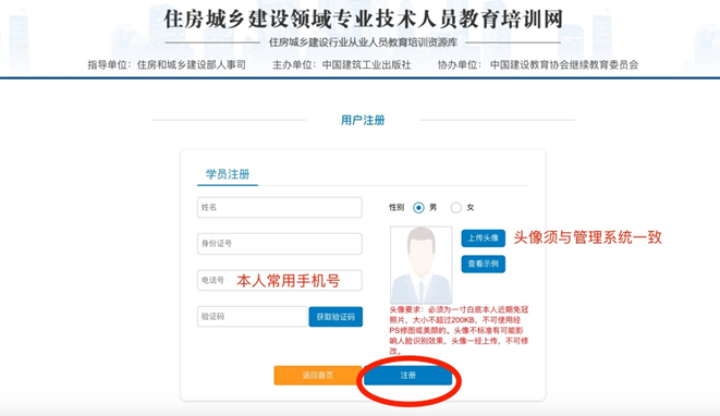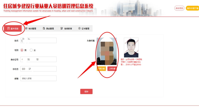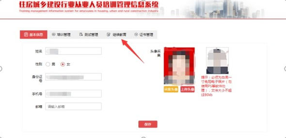 注冊(cè)成功進(jìn)入系統(tǒng)后,請(qǐng)完善個(gè)人信息,上傳本人照片( 必須為本人近期一寸白底免冠照片, 文件大小不超過80KB),請(qǐng)確保本人照片無誤,一經(jīng)上傳不可修改。在【證 書管理中】可查詢已經(jīng)由建設(shè)行業(yè)行政主管部門上傳的有效證書,完成繼續(xù)教育后即可換發(fā)電子培訓(xùn)合格證。