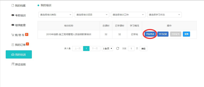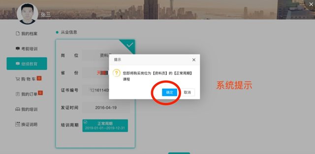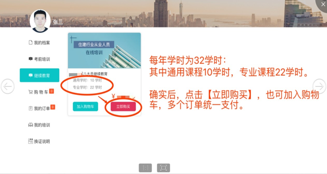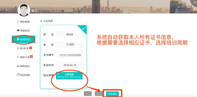 首次注冊(cè)成功后,系統(tǒng)自動(dòng)跳轉(zhuǎn)到個(gè)人用戶頁面,將從部管理系統(tǒng)中下載本人已有證書信息,選擇需要進(jìn)行繼續(xù)教育學(xué)習(xí)的證書后,進(jìn)行提交,系統(tǒng)自動(dòng)生成課程訂單。