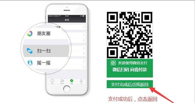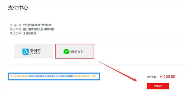 訂單生成后,點(diǎn)擊【立即購買】,頁面將跳轉(zhuǎn)到在線支 付頁面,可選擇【微信】或【支付寶】進(jìn)行支付,在新頁面 掃描支付二維碼完成支付,支付成功后,系統(tǒng)提示將自動(dòng)返回培訓(xùn)網(wǎng)界面。(推薦使用微信支付)