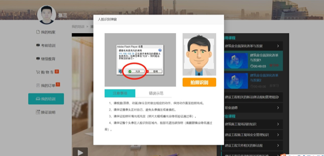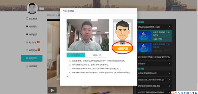 彈出攝像頭人臉識(shí)別框后學(xué)員本人將面部對(duì)準(zhǔn)攝像頭, 點(diǎn)擊“拍照識(shí)別”,系統(tǒng)將進(jìn)行動(dòng)態(tài)面部識(shí)別,識(shí)別成功后自動(dòng)跳轉(zhuǎn)學(xué)習(xí)界面進(jìn)行學(xué)習(xí),請(qǐng)務(wù)必保證本人信息真實(shí),經(jīng)核查系統(tǒng)抓拍照片,如發(fā)現(xiàn)替學(xué)情況,系統(tǒng)將進(jìn)行學(xué)時(shí)清零, 需重新學(xué)習(xí)。